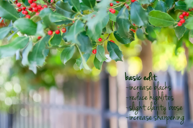 What I love most about it is the bright green bokeh in the background. But I also love the pop of color from the red berries, the great pointed shape of leaves, and the blurred lines of the iron fence created by the shallow depth of field. I would say that overall, this shot is pretty well exposed...no major blown highlights or shadows. It might be a teeny bit overexposed, but I did that intentionally to account for the fairly strong backlight.